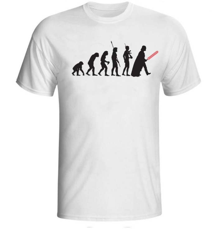 Skvěle vypadající pánské tričko, bílé barvy, evoluce Star wars. Pro všechny fanoušky George Lucase a hvězdných válek. Skvěle padne a ještě líp vypadá. Tričko je velmi pohodlné. V tomto tričku budete vypadat skvěle a určitě zapadne do Vašeho šatníku.