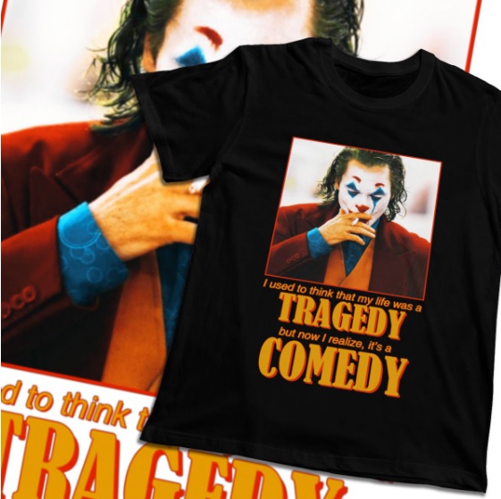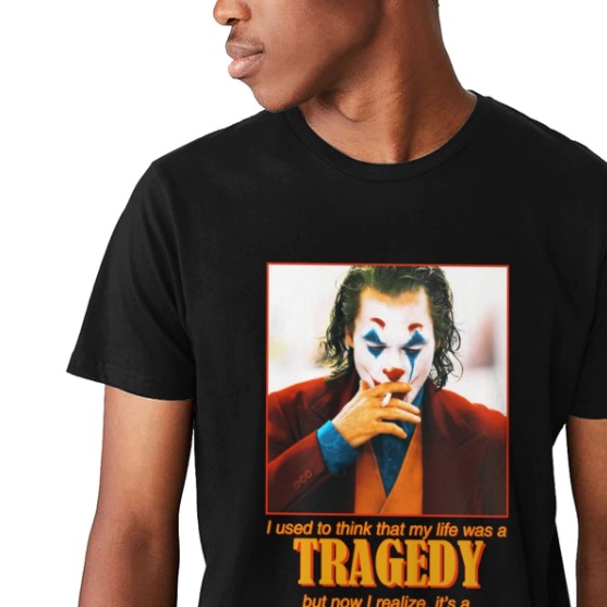 Pánské stylové tričko Joker/Tragedy comedy, na motivy úspěšného filmu Joker. Kdo by neznal klauna, úhlavního nepřítele batmana. Pro Všechny milovníky tohoto cool filmu. Další skvělý kousek do Vašeho šatníku. Tričko má velmi kvalitní a stylový potisk, velmi dobře padne a je vyrobené ze 100% bavlny. S tímto tričkem budete vypadat skvěle.